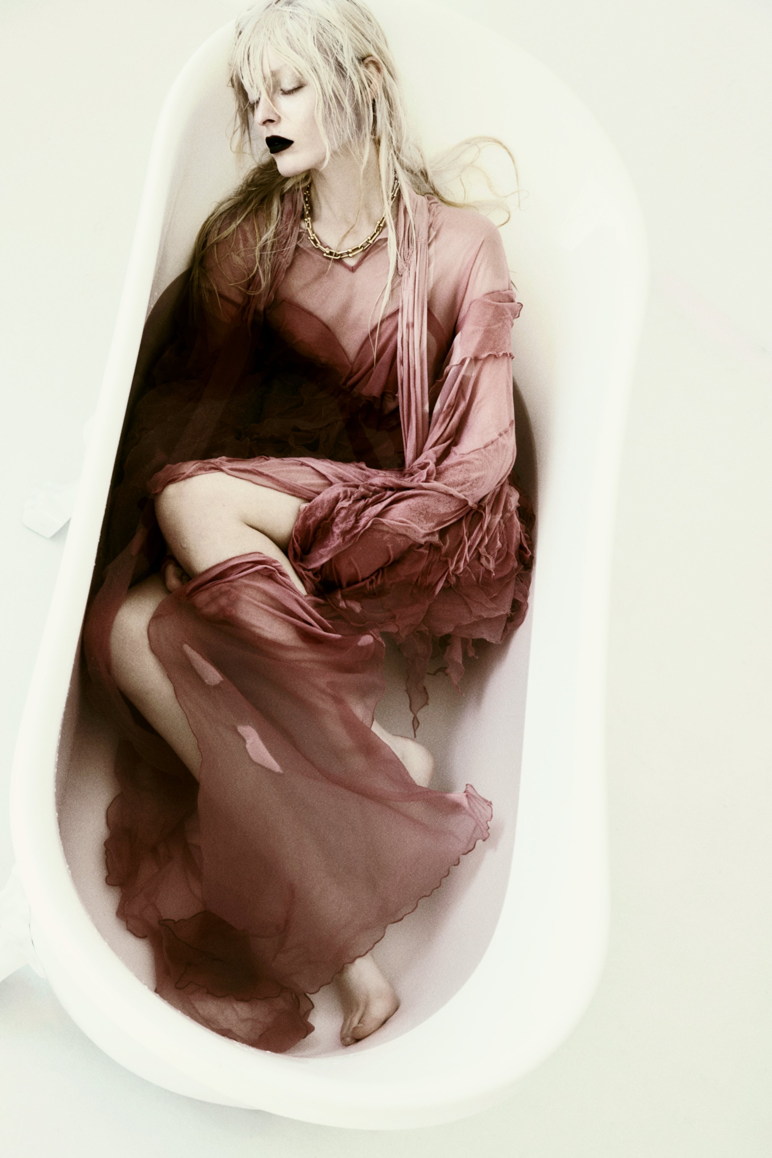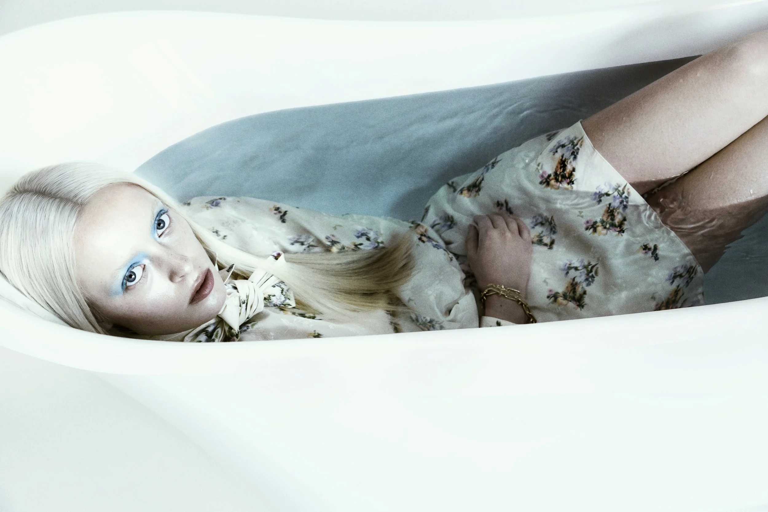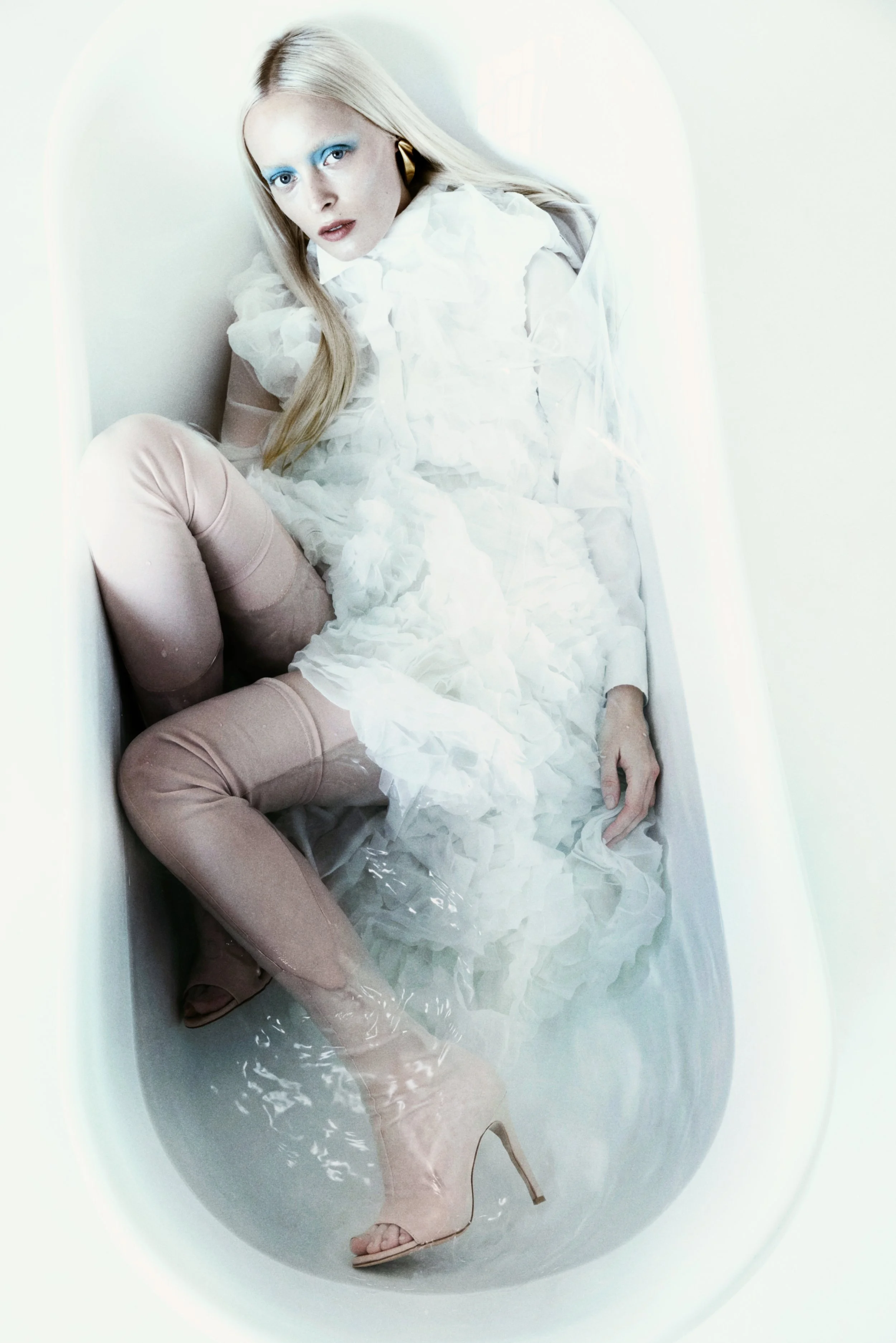 In this editorial, VINCENZO VALENTE invites us into a liminal space: a bathtub filled with water suspended in a whited-out realm. In an ode to texture, Valente captures POLLY in architectural positions; at times one with the water, at times transcending the elements with structural authority. As the clothes are shaped by the liquid, texture and depth take centre stage, with colours ranging from saturated whites to reddish blacks and glimmering golden browns. It all renders as a highly tactile study in contrasts: light and dark, clear and murky, soft and rough, dry and wet.