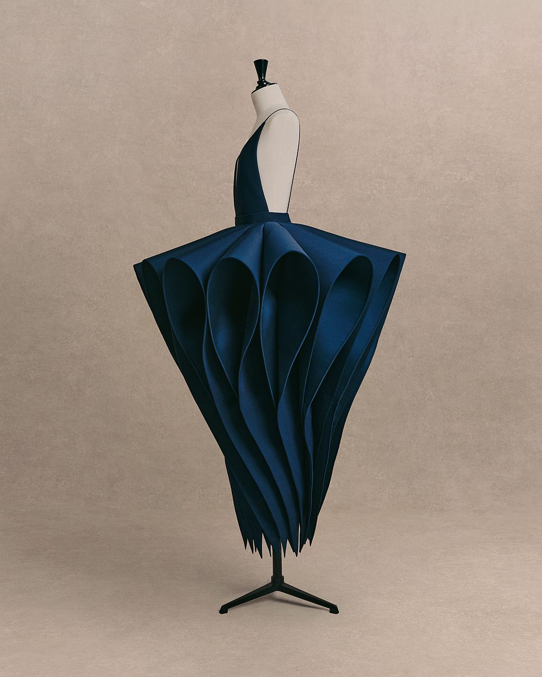 Erin Doherty delivered dark goddess on the carpet when she stepped out in a midnight blue silk faille gown with a deep V-neckline and backless fitted bodice, styled with black satin pumps. The sharply tailored bodice defines the waist before expanding into a sculptural skirt composed of 14 pleated panels radiating outward in inverted geometric cone shapes—structured at the top and softening toward their pointed ends. The result is a dramatic, powerful silhouette that marries couture craftsmanship with a futuristic edge. Requiring more than 450 hours of work and assembled almost entirely by hand, the gown stands as a testament to meticulous construction and rigorous attention to detail.