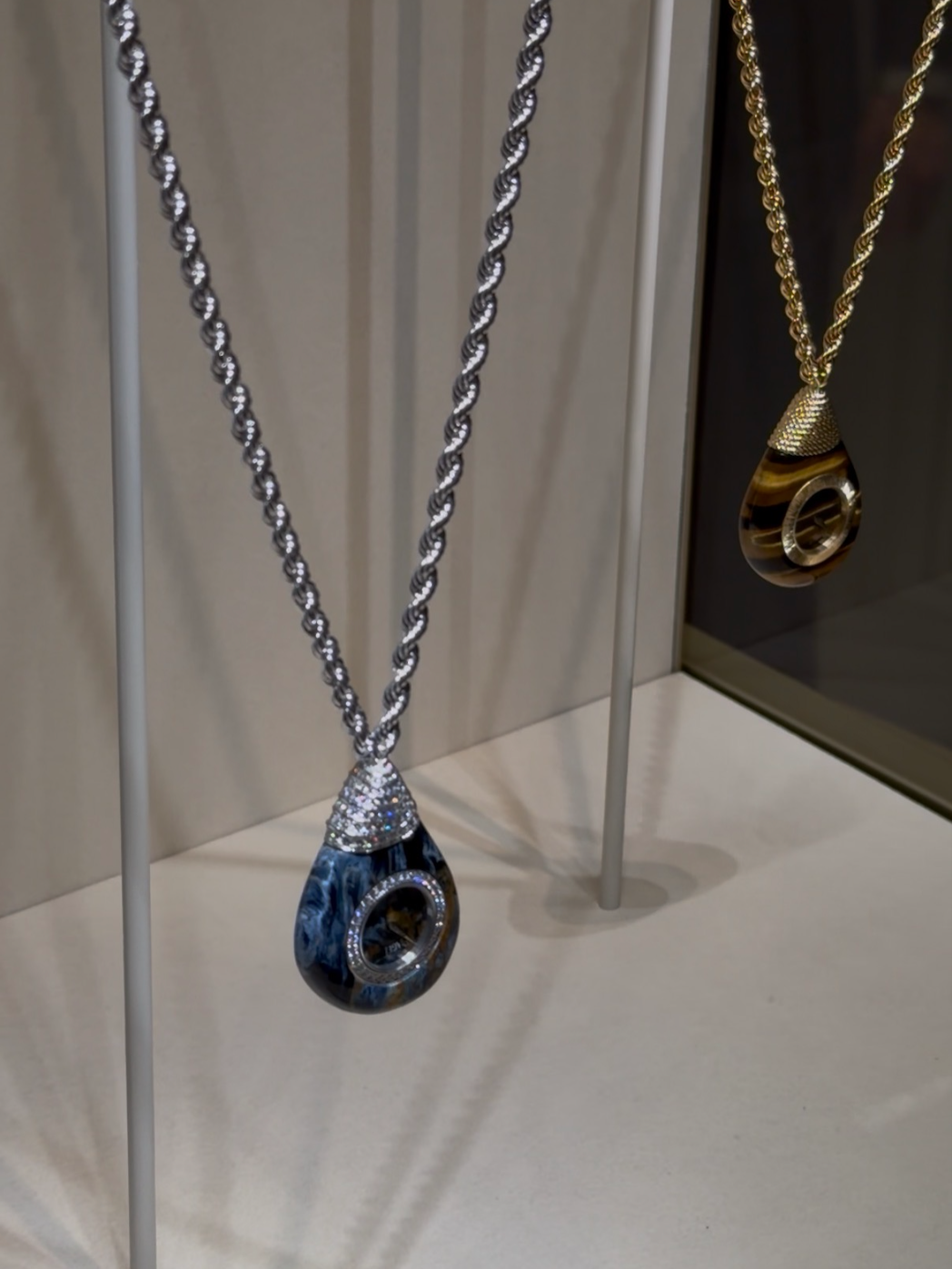 At the more sculptural end, the Swinging Pebbles concept pushes the idea of stone even further. Worn from the neck, the dial is upside down to be legible when lifted up to the wearer. Entire cases are carved from blocks of ornamental stone, making each piece effectively a single material object. The watch becomes less about assembly and more about extraction with its form being revealed from within the stone itself.
