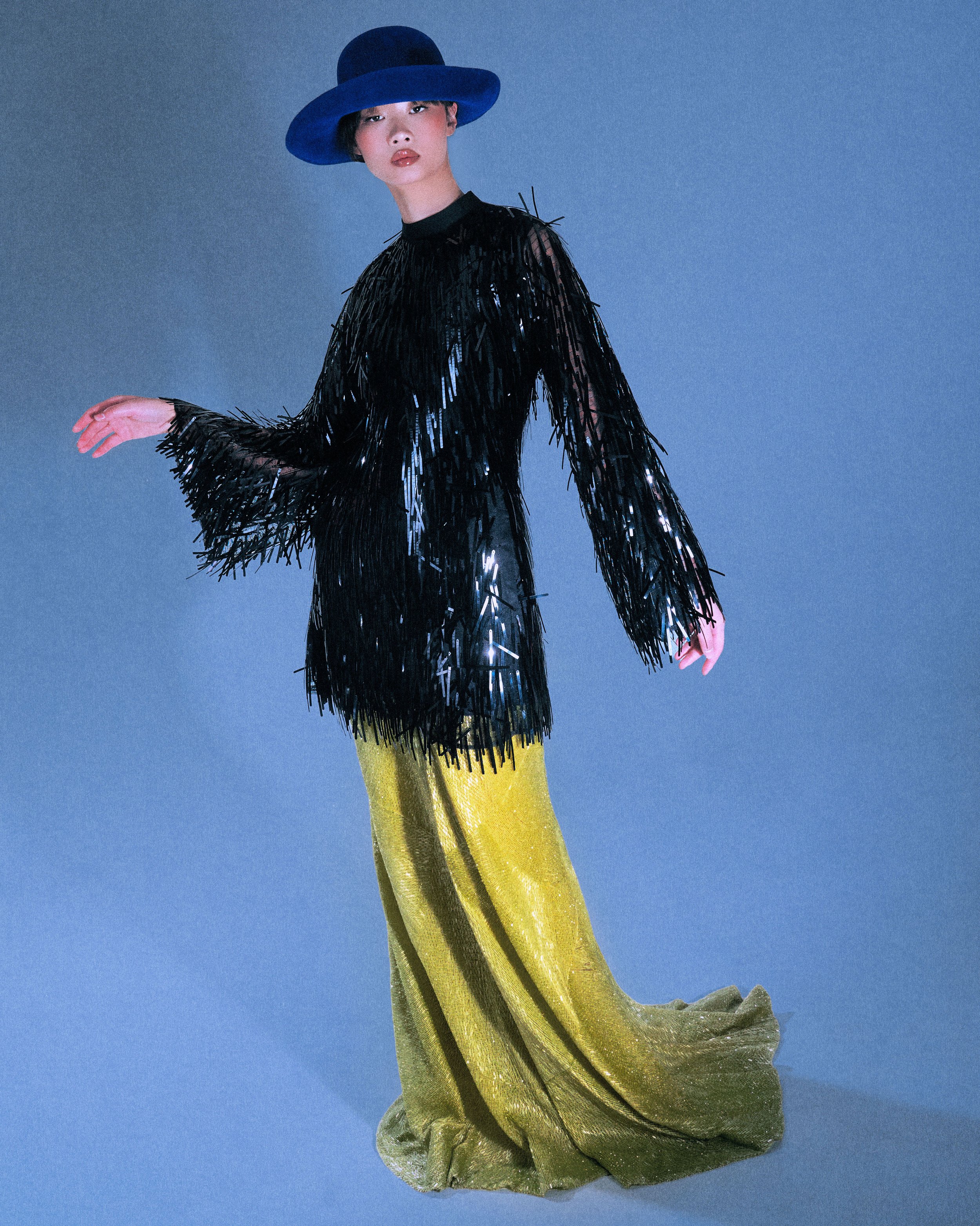 Captured by Luke Stage, ‘Luxe’ shimmers and shines through metallic tones and sheer textures that catch and reflect light, giving the images a luminescent and tactile quality. Huan Zhou and Marlee B move between closeness and distance, captured as gazing and being gazed at. Their presence shifts between structured, with sculptural poses, and fluid movement.