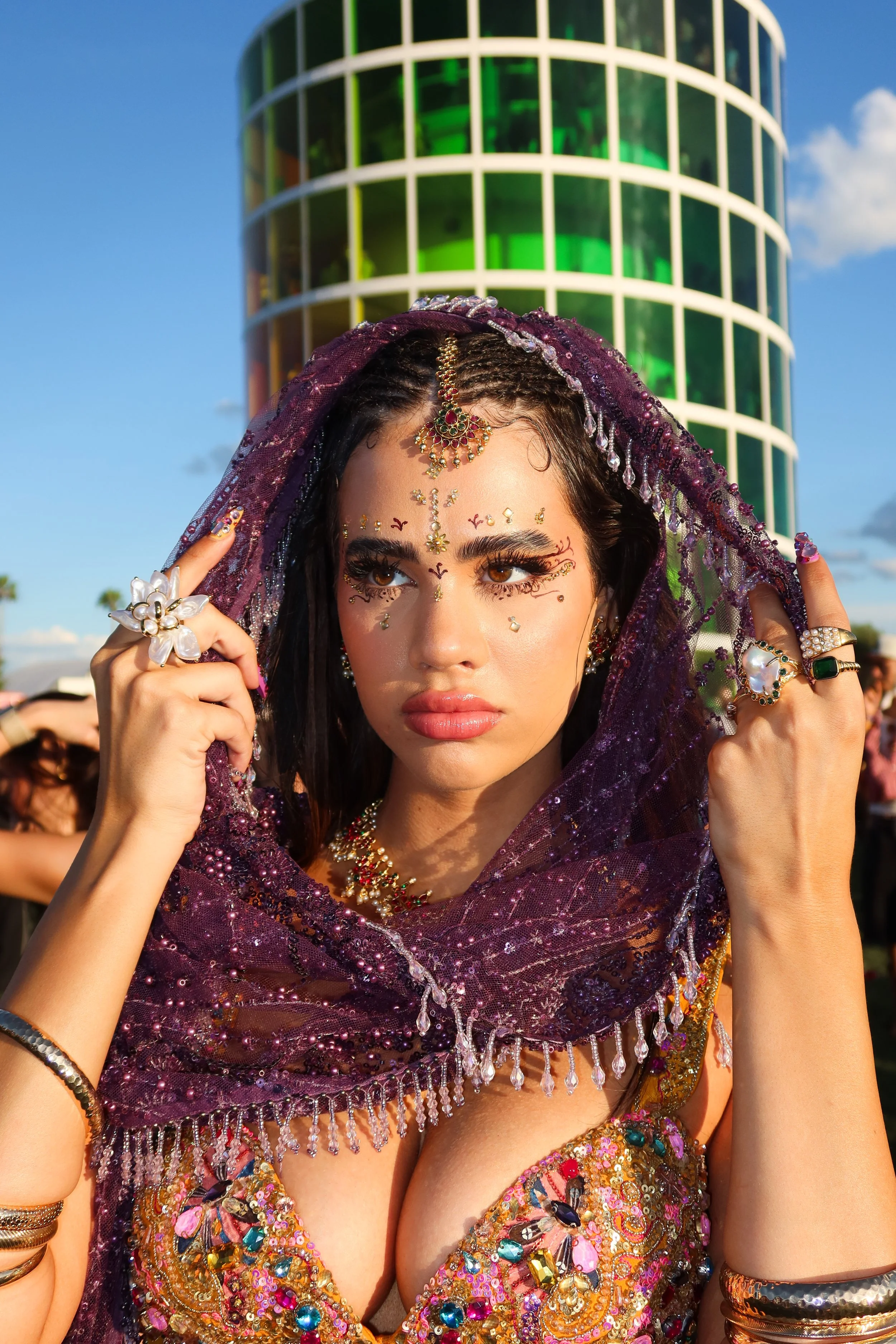 It really started with wanting to wear a sari to Coachella. I hadn’t personally seen it done at the time, and I was looking for a way to incorporate my heritage into my content in a way that felt intentional. From there, it evolved into using fashion as a form of expression and storytelling. The next major moment was creating a custom piece that said “fuck the patriarchy,” which aligned with the conversations I had just started having online about womanhood and societal conditioning. Since then, my style at Coachella has become more conceptual and more personal. It’s less about trends and more about identity, beliefs, and storytelling through fashion.