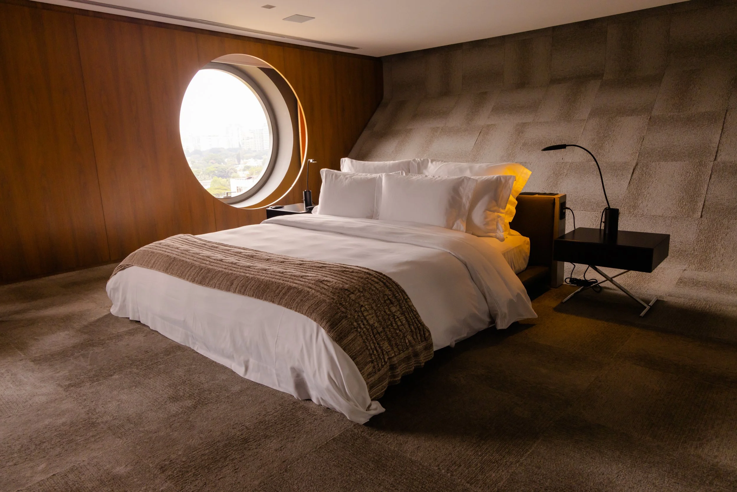 Originally designed by Ruy Ohtake, his style is still very much present. Though there have been recent renovations, the goal was never to alter his legacy, but rather to just build upon it. Led by João Armentano, the update focuses on clean lines, mixed with curves and lighting, while keeping the building’s character untouched. This renovation gave birth to a new getaway experience: The Mayfair Room, created through a merging of two rooms. Featuring doubled round windows that overlook São Paolo’s cityscape— almost like a pair of eyes— and furnished with signature artisan armchairs, it is definitely a favorite addition.